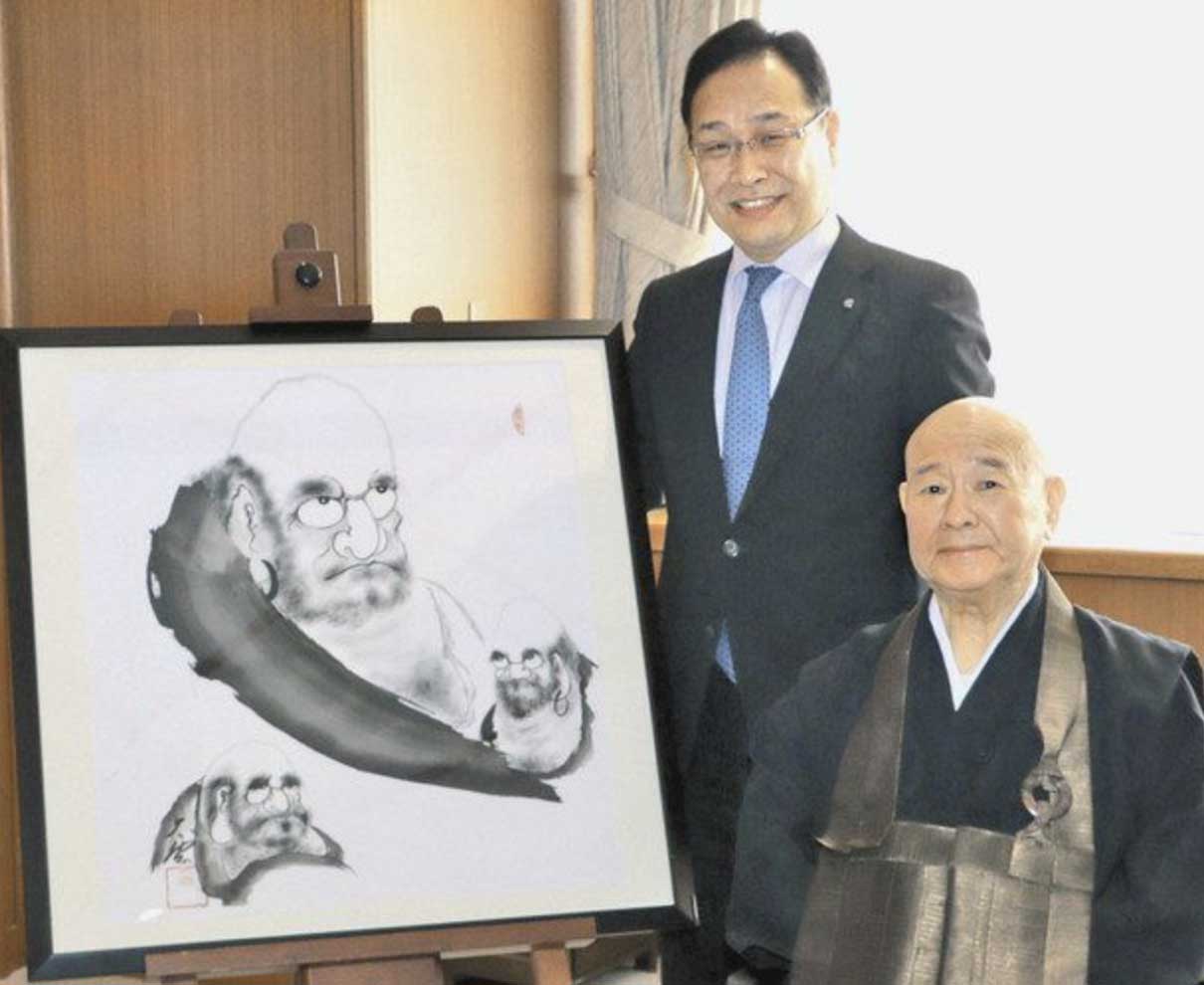 美浜町佐柿の徳賞寺住職で画家としても活動する粟谷正光(あわやしょうこう)さん(73)の作品「而今(にこん)」が、仏・パリで開かれた世界最古の国際公募展「ル・サロン」で九年連続入選を果たした。禅の心を表現するだるま大師三体を通して、過去、現在、未来を描いた水墨画が高く評価された。粟谷さんは「描くことは自分の体の一部。最期まで筆を持ち続けたい」と思いを語った。 (林侑太郎)