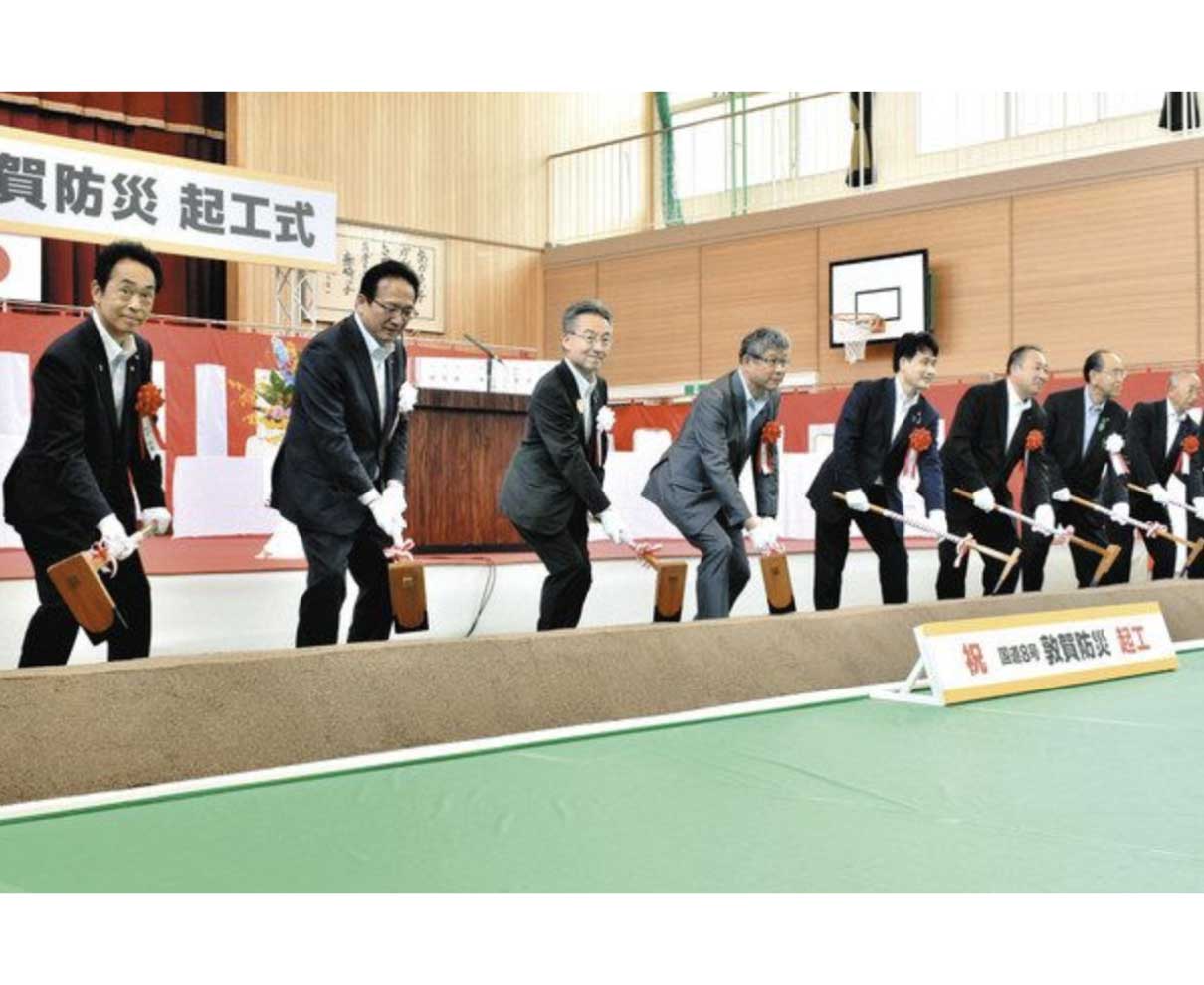 敦賀市北東部の挙野、田結地区を結ぶ「国道8号敦賀防災」道路の起工式が二十二日、同市旧赤崎小学校であった。事業主体の国のほか、県や市の関係者ら約五十人が出席し、工事の無事と道路完成を願った。