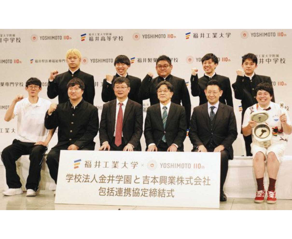 福井工大などを運営する金井学園(福井市)は二十三日、大手芸能事務所「吉本興業」と包括連携協定を締結した。学生と福井出身の芸人らが出演するテレビ番組を放送。学校、地域の魅力や課題を発信し、地域創生につなげていく。 (玉田能成)
