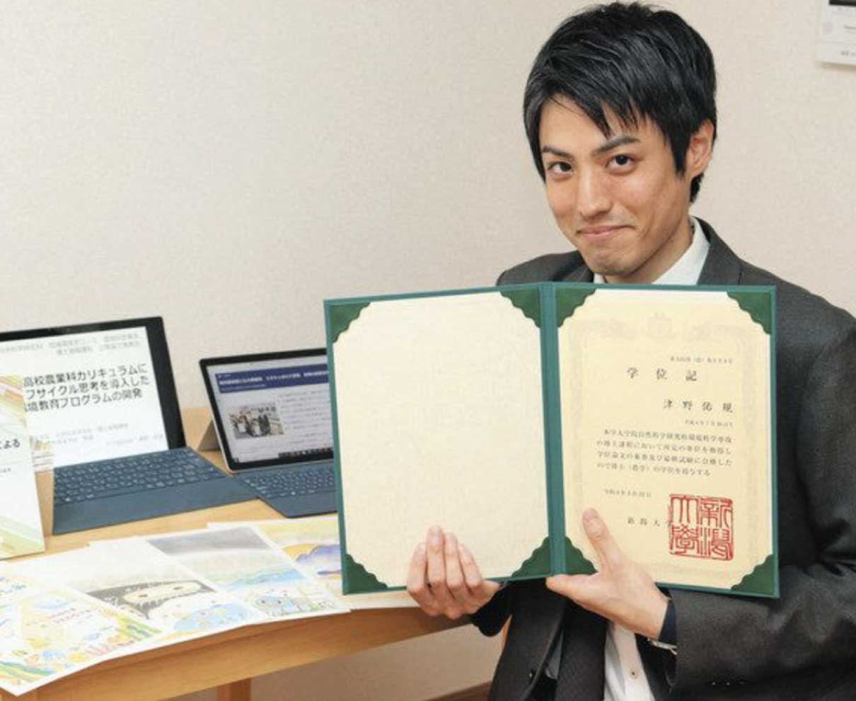 教壇に立ちながら大学院で研究を続けてきた福井農林高校の津野佑規教諭(29)=鯖江市=が農学博士を取得した。県教委によると、フルタイム勤務の県立高教員が博士になるのは珍しい。津野教諭は「ブラックと言われがちな教員の仕事だが、周囲の協力もあり、研究と両立できると示すことができた。教員を目指す子たちの励みになれば」と喜んでいる。 (曽根智貴)