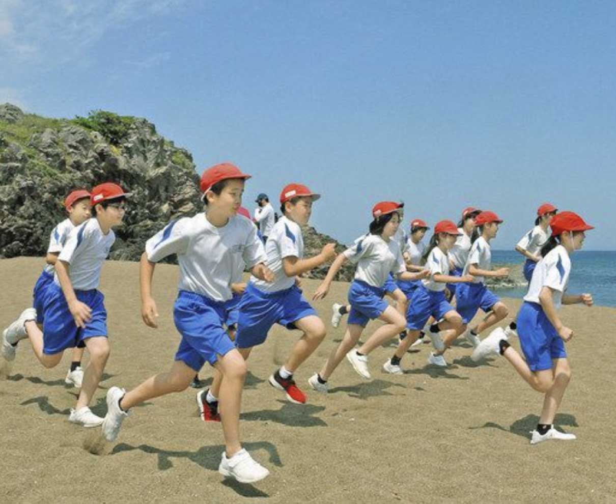 福井市鷹巣小中学校で恒例の砂浜マラソンが二十五日、同市の鷹巣海水浴場で行われた。新型コロナ禍の影響で三年ぶりの開催。快晴にも恵まれ、青々とした海を前に子どもたちが元気よく駆けた。