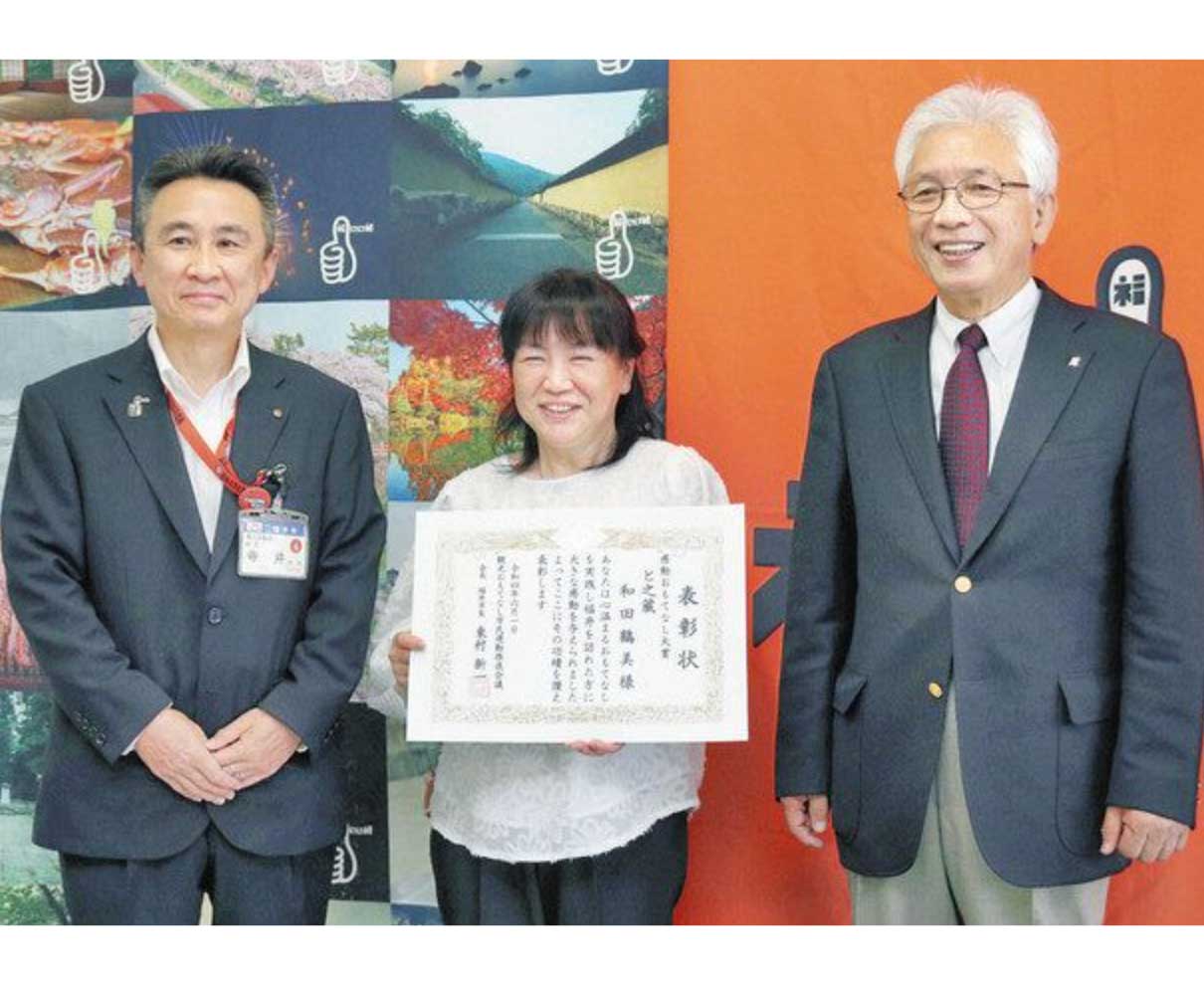来県した観光客をもてなした個人・団体を表彰する「感動おもてなし大賞」の表彰式が一日、福井市のアオッサであった。勝山市平泉寺町の観光案内施設「と之蔵」のスタッフ和田鶴美さん(62)が受賞した。 (水野志保)