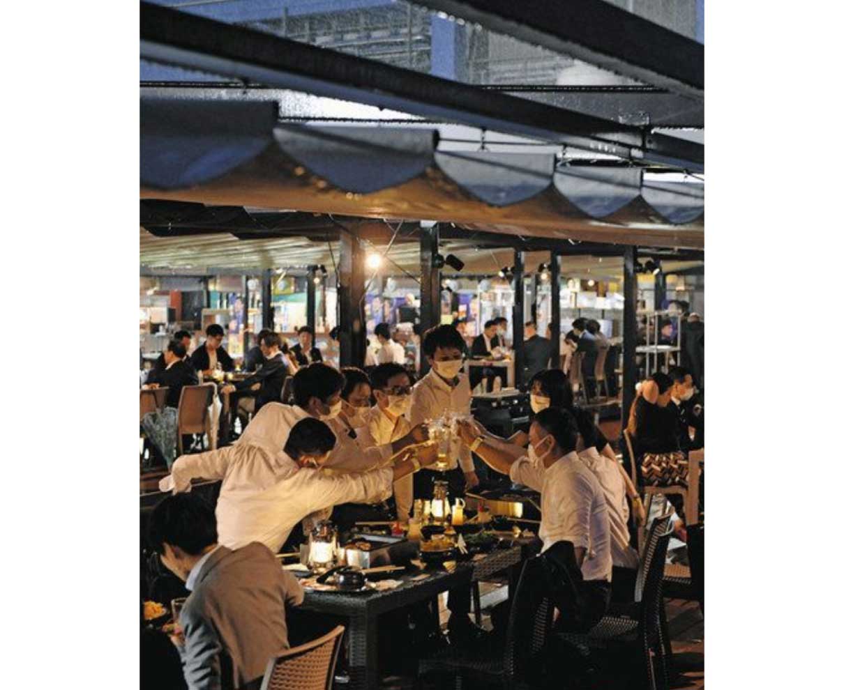 福井市の西武福井店屋上で毎年恒例のビアガーデン「そらのガーデン」が15日、オープンした。初日は雨が降る中、仕事終わりの会社員らが、グラスを片手に楽しんでいた。