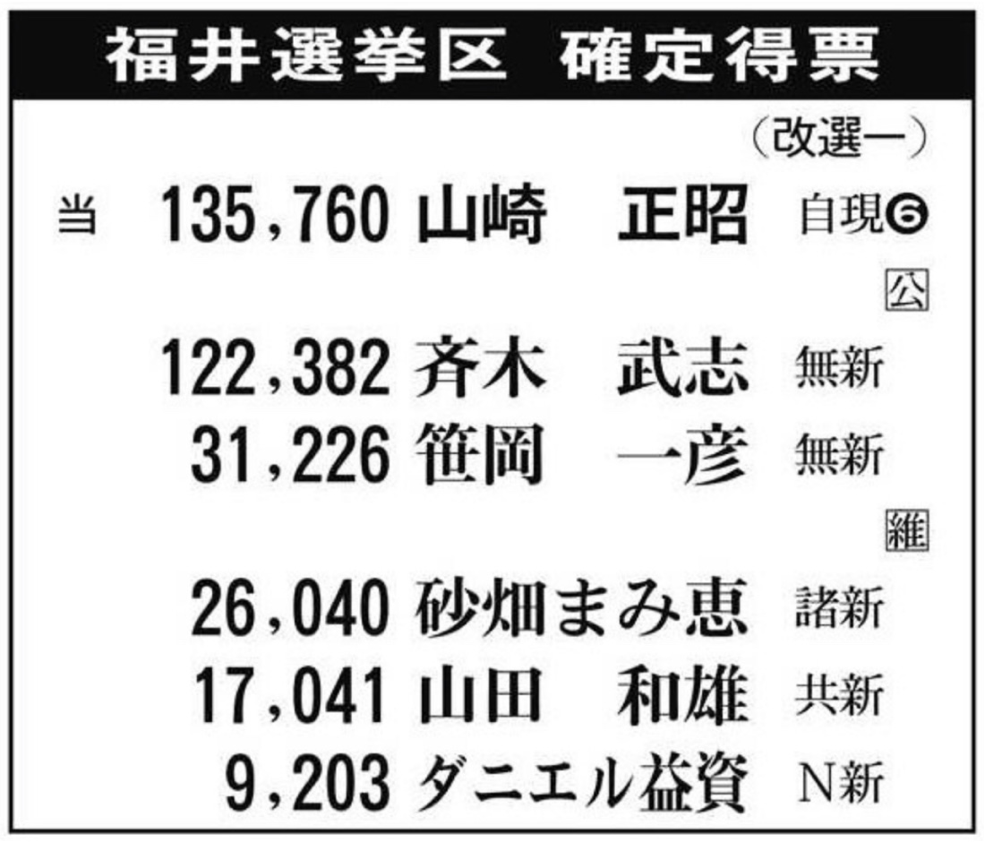 参院選福井選挙区(改選数1)は、元参院議長で自民現職の山崎正昭氏(80)=公明推薦=が13万5000票余りを獲得し、次点の元衆院議員で無所属新人の斉木武志氏(48)に1万3000票差をつけて6選を果たした。