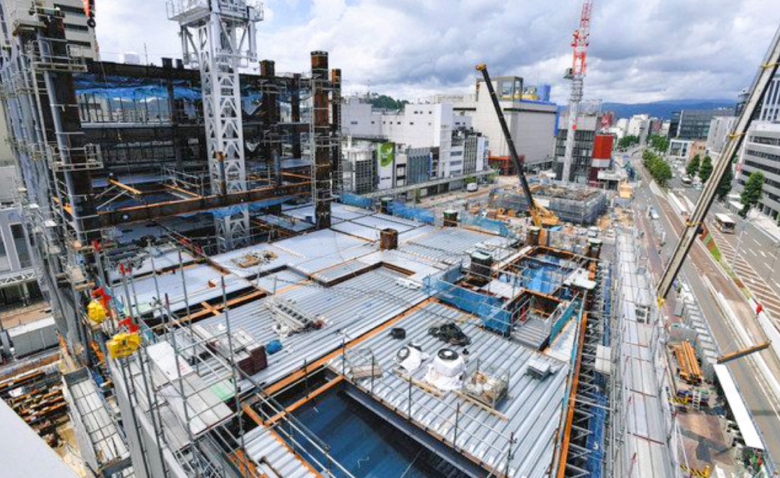 ホテル・オフィス棟(手前)は高さ30メートルまで鉄骨が組み上がってきた。奥では住宅棟の建設工事も本格化している=福井市中央1で(蓮覚寺宏絵撮影)JR福井駅西口では、2024年春の北陸新幹線県内開業を見据えた再開発工事が日々進んでいる。12日には通称「三角地帯」西側のB街区でアーケードなどの解体工事が始まった。隣接するA街区では「ホテル・オフィス棟」の鉄骨が高さ30メートルまで組み上がり、住宅棟の建設も本格化している。「県都の玄関口」の整備が加速している。(北原愛)