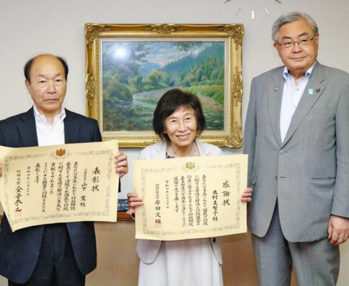 行政相談委員として住民の困り事に寄り添う相談対応など長年の功績が認められ内閣総理大臣感謝状を受賞した米村美智子さん(81)=福井市和田三=と、同じく行政相談委員として総務大臣表彰を受賞した山下寛さん(73)=同市布施田町=が25日、同市役所を訪れ、東村新一市長に喜びを報告した。(水野志保)