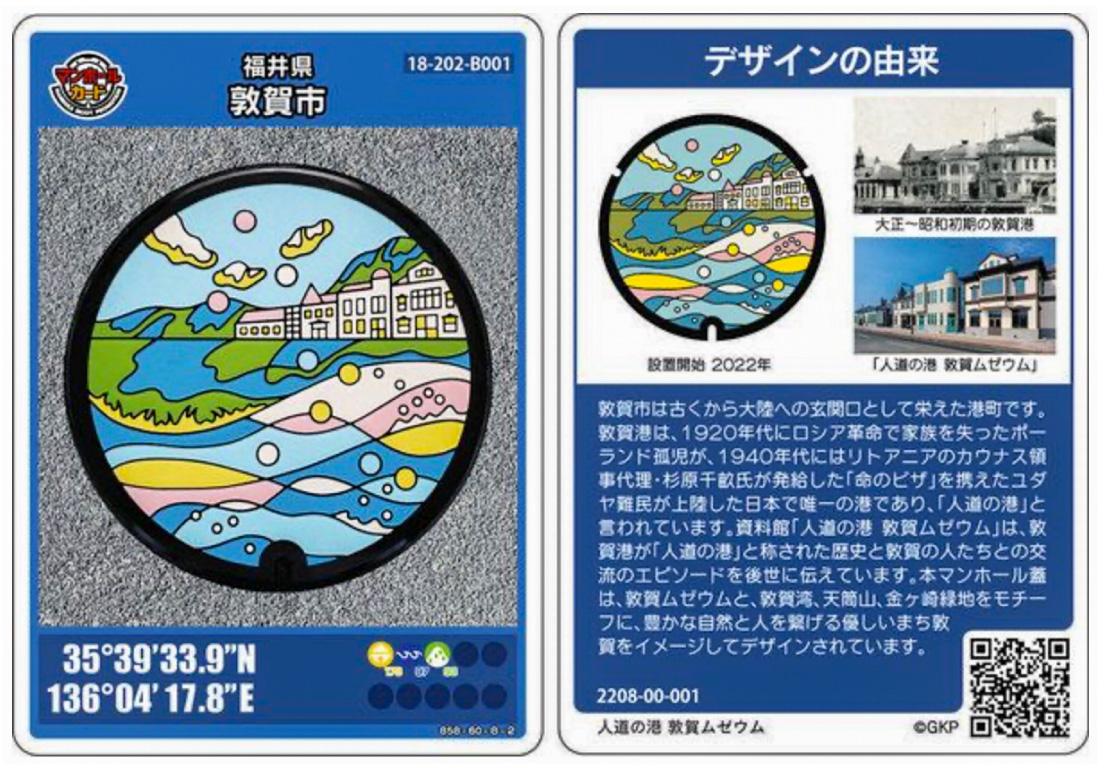 敦賀市はイラストレーター・松尾たいこさんがデザインしたマンホールカードを6日から配布する。「人道の港」をテーマに、豊かな自然と人をつなげる優しいまちをイメージした。