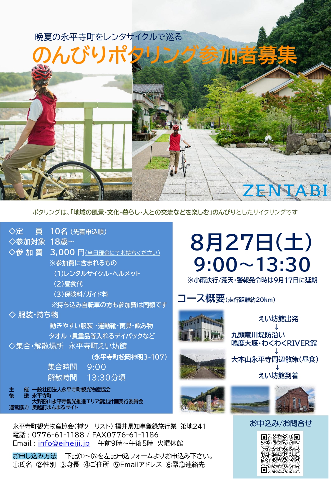 当日は『えい坊館』に集合し、『鳴鹿大堰・わくわくRIVER館』から『大本山永平寺』へ向かい、昼食は永平寺門前で「精進料理」を味わいます。途中、九頭竜川堤防沿いや永平寺参ろーどといったサイクリングにぴったりなコースを通り、旧松岡藩の風情が残る「松岡十二曲がり」のまちなみなどの景観も楽しめます。