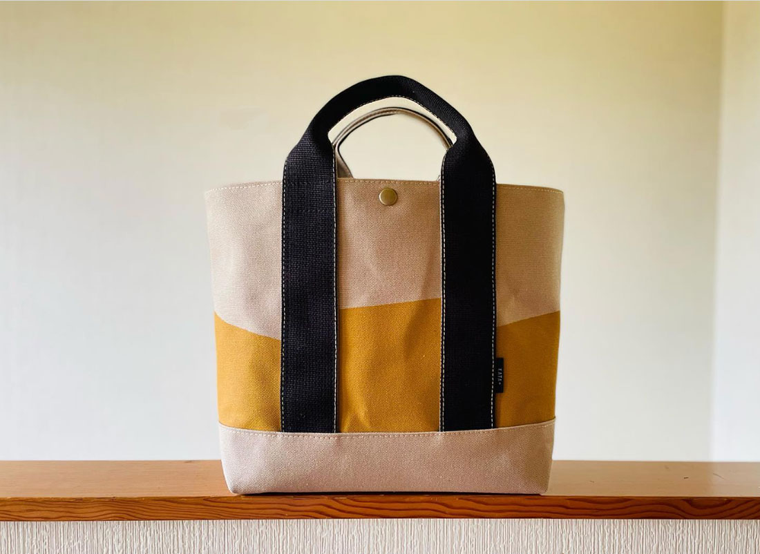 シンプルなものから、オリジナルプリントやステッチ、異素材との組み合わせなど、持っているだけで嬉しくなるようなものづくりを心掛けていると話すKATA+(カタプラス)さん。今年の展示会に合わせて「シンプルだけど、少しだけアートっぽさが感じられる作品」(KATA+さん)を製作。かばんの形に裁断した帆布の生地に、マスキングやステンシルでペイントしたものや、シルクスクリーン印刷してから仕立てたかばんは、プリント生地にはない楽しさが見つかります。