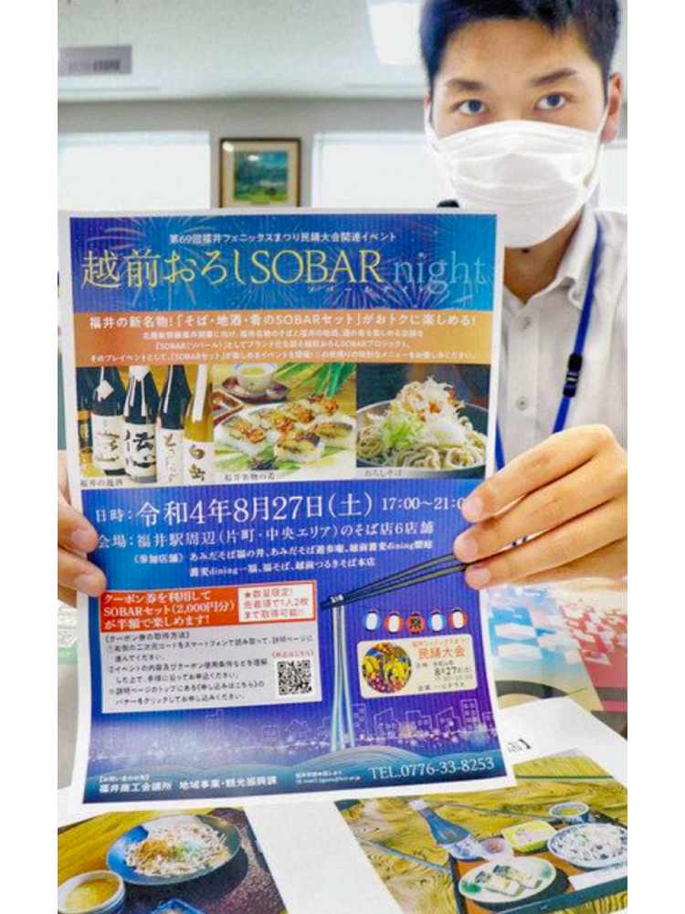 福井名物のおろしそばと地酒、へしこや鯖寿司(さばずし)といった酒のさかなを味わう「越前おろしSOBAR(ソバール) night(ナイト)」が27日夜、JR福井駅周辺で催される。6つのそば店が、2000円相当の限定メニュー(各店30食)を1000円で提供。イベント参加には、事前のクーポン券取得が必要だ。(北原愛)