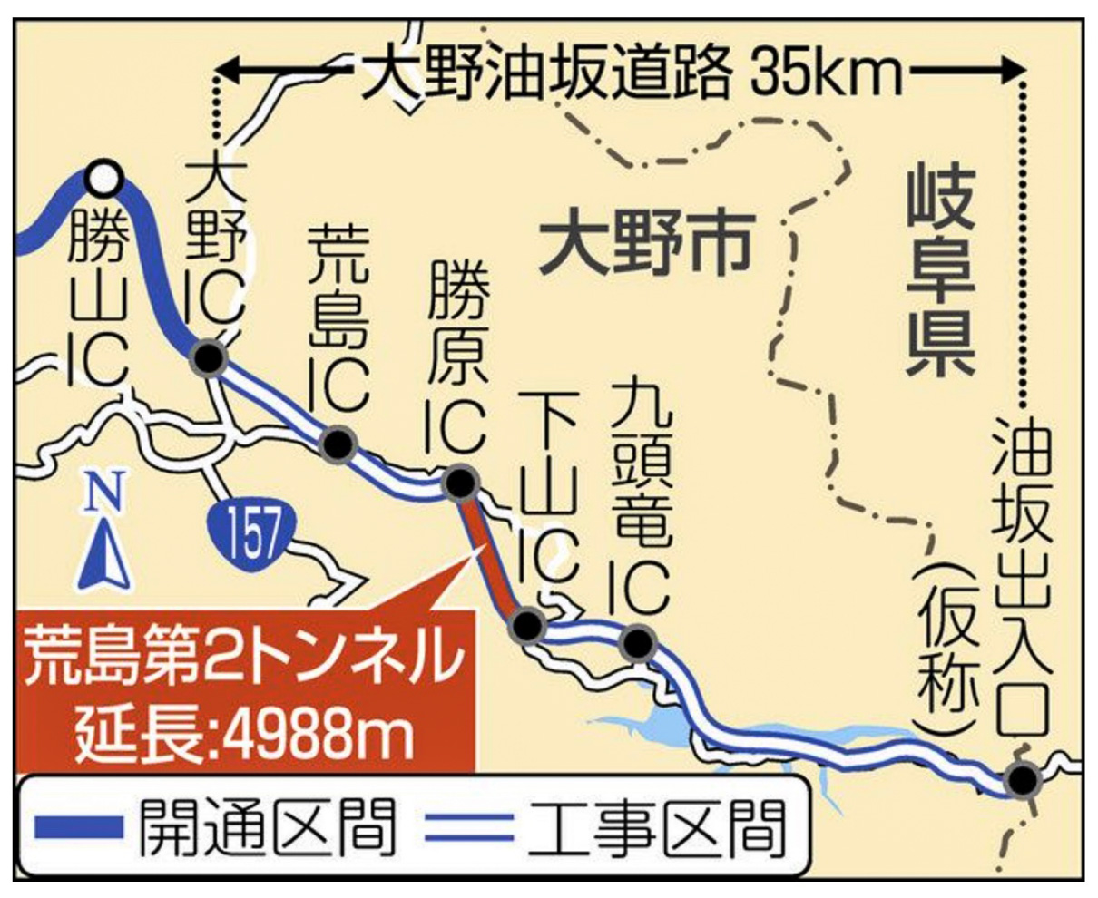 中部縦貫自動車道の大野油坂道路(35キロ)で、掘削が難航していた荒島第二トンネル(4988m)が3日、貫通した。同トンネルは県内の道路トンネルでは最長となる。トンネルを含む勝原インターチェンジ(IC)−九頭竜IC間(9.5km)は2023年秋に開通の予定。トンネルがようやく貫通したことで、26年春を予定する全線開通に向けて大きく前進し、関係者が貫通を祝った。(中場賢一)