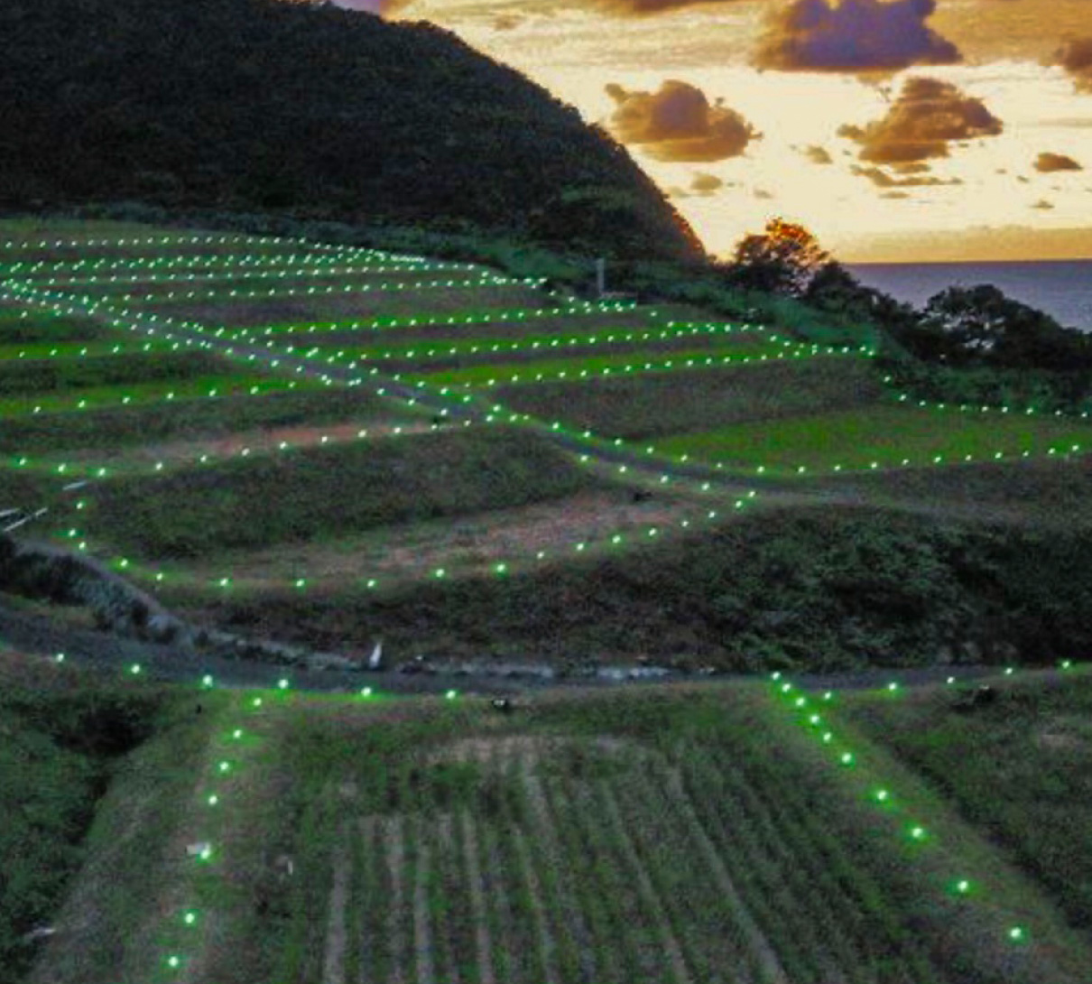 小浜市田烏の棚田でライトアップイベント「たがらす棚田キャンドル」が開かれ、発光ダイオード(LED)ライトの鮮やかな光が段になって連なる海辺の田んぼを彩っている。15日まで。