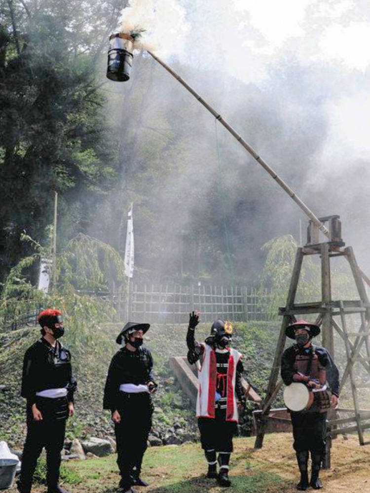 戦国時代に敵襲や出陣の合図として使われたのろしを現代に復活させるイベントが16日、美浜町佐柿の若狭国吉城歴史資料館で開かれた。甲冑姿の歴史愛好家らも参加し盛り上げた。