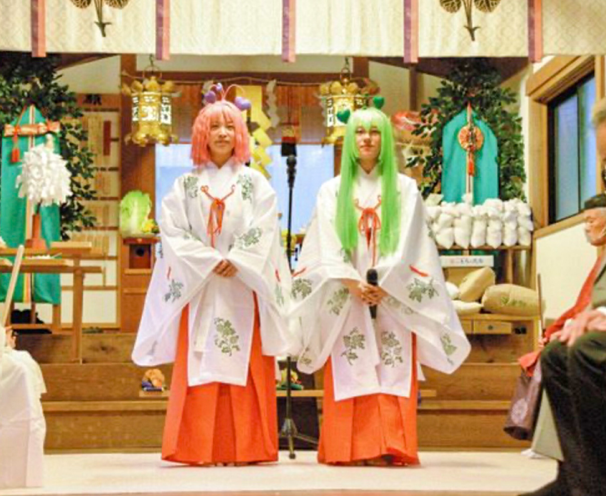 福井市加茂町の賀茂神社の創建1300年と、県文化財の大鳥居などの修復工事が完了したことを祝う大祭が23日、境内であった。福井の伝統工芸アイドル「さくらいと」のメンバーが神社のマスコットキャラクターにふんして歌う歌や、地元小学生の舞が神前に奉納された。