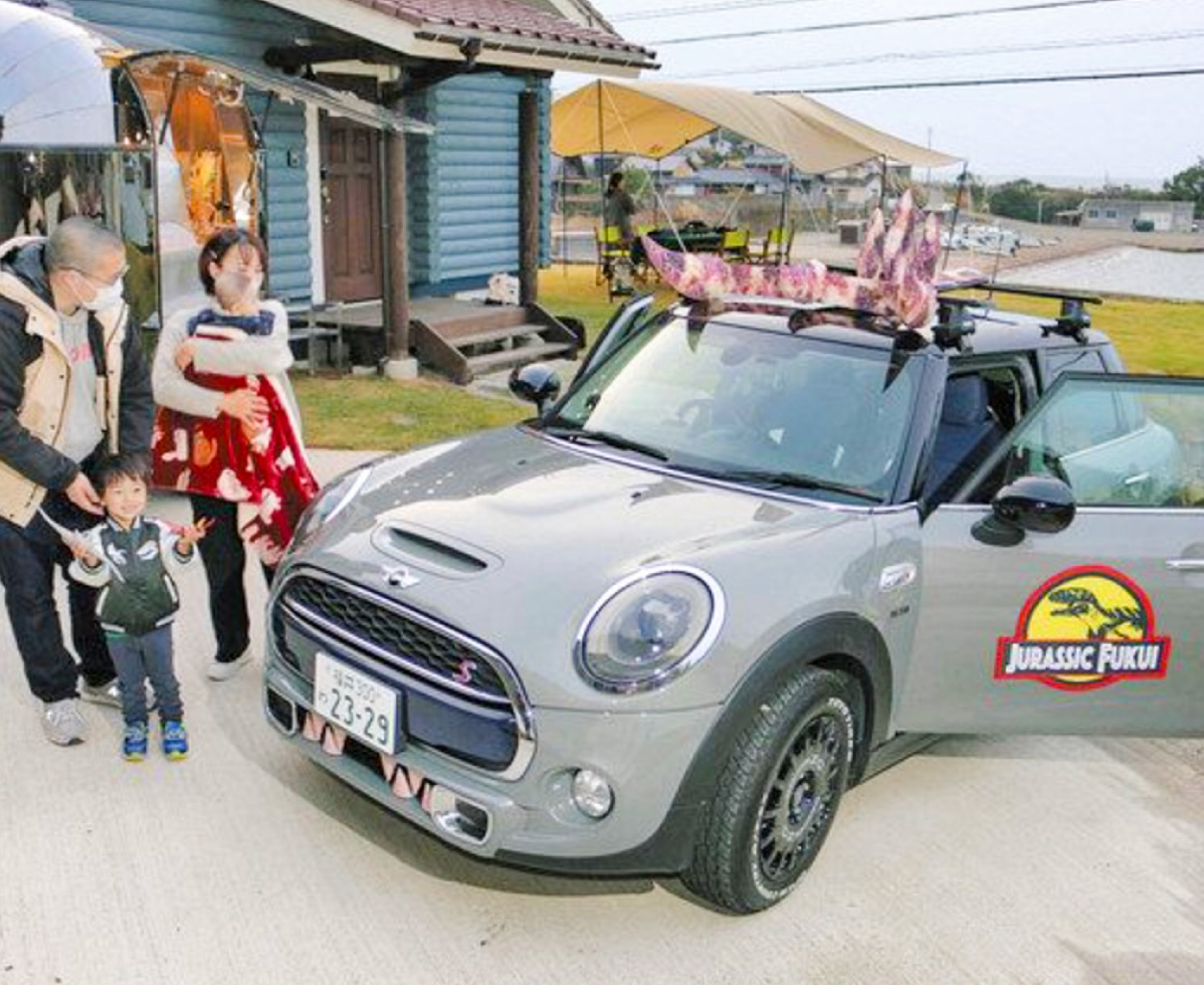 電車やバスに続き恐竜をテーマにした新たな交通手段が、県内に誕生しそうだ。北陸新幹線県内延伸を見据え、外観を装飾した「恐竜レンタカー」を使った旅行プランの開発が進んでいる。来年度の商品化を目指して22、23の両日、モニターツアーが行われ、坂井市の宿泊施設では車両が報道陣に公開された。(畑明日香)
