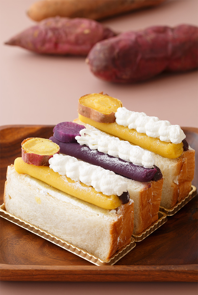 サツマイモの自然な甘さを生かしたペーストに、あんこや生クリームが加わり、まるでケーキのような華やかさ。さらに和菓子のような味わいを兼ね備えた和洋折衷の一品に仕上がっています。こだわりの食パン生地は耳まで柔らかく、もっちりとした食感。しっかりと重量感もあり、満腹必至の新サンドです。