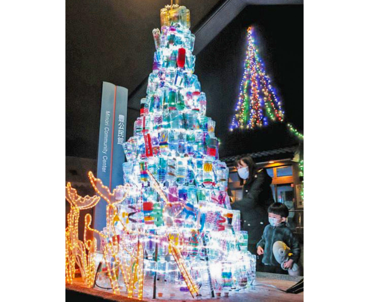 福井市豊(みのり)公民館で、ペットボトルを再利用したクリスマスツリーのイルミネーションが飾られている。地区住民や豊小学校の児童らが力を合わせて作り、25日に点灯を開始。訪れた人たちは写真を撮ったり、近づいて細部を眺めたりして楽しんでいた。