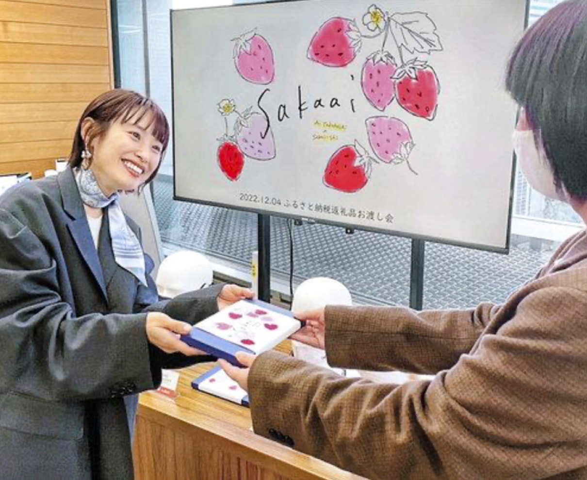 坂井市が俳優・モデルの高橋愛さん(同市出身)と連携して開発したふるさと納税の返礼品の受け渡し会が4日、東京都内であった。高橋さんが寄付者にマスクやスカーフを手渡し、感謝を伝えた。(山本洋児)