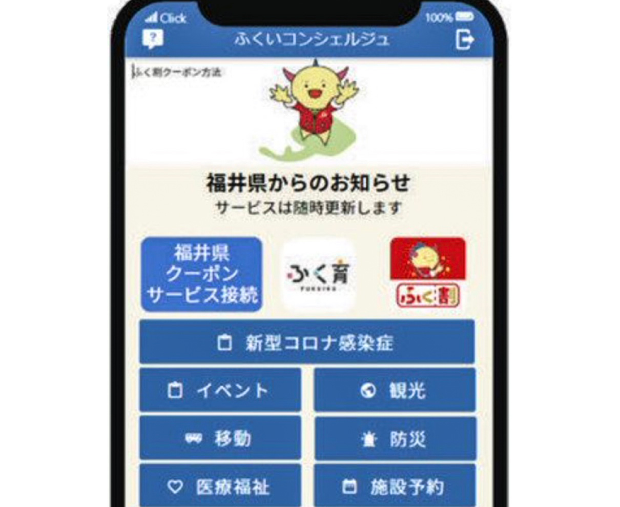 県は、県や市町が提供する情報が一目で見られ、消費喚起事業の割引クーポンが取得できる「ふく割」やその他の優待サービスを連携させて使えるポータルアプリ「ふくいコンシェルジュ」を開設した。活用の第1弾として、「ふく割」と子育て世帯向け優待サービス「ふく育」を連携させ、ふく育登録者に限定したクーポンを発行している。
