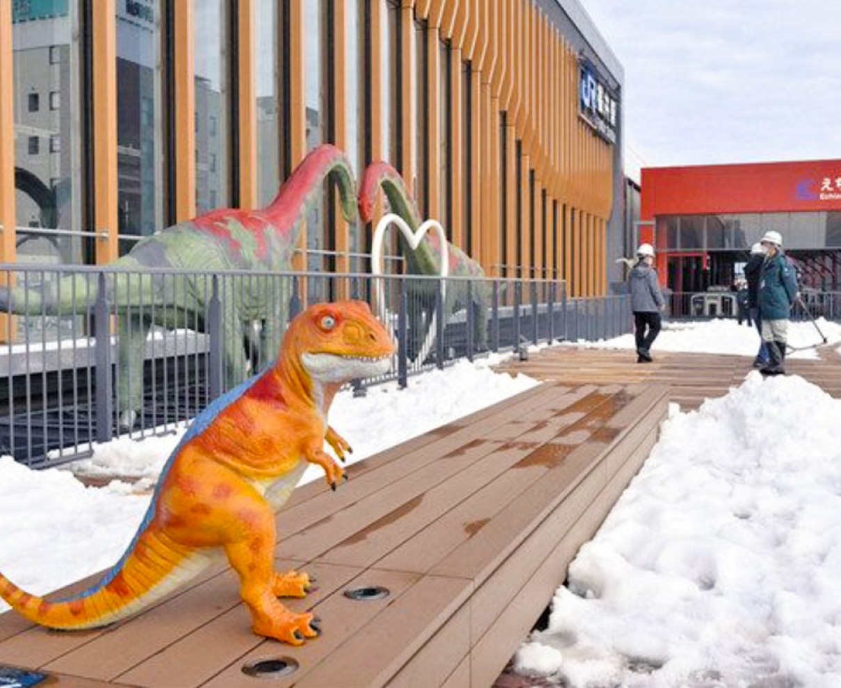 北陸新幹線の県内開業をあと1年余りに控え福井市は、福井駅東口に新設する市観光交流センターの屋上広場に、新たな恐竜モニュメント9台を設置した。新幹線のホームや車窓から見える位置にあり、顔を寄せ合う2頭の姿がハート形に見える夫婦の恐竜や、越前がにをくわえた恐竜などが観光客を出迎える。 (成田真美)