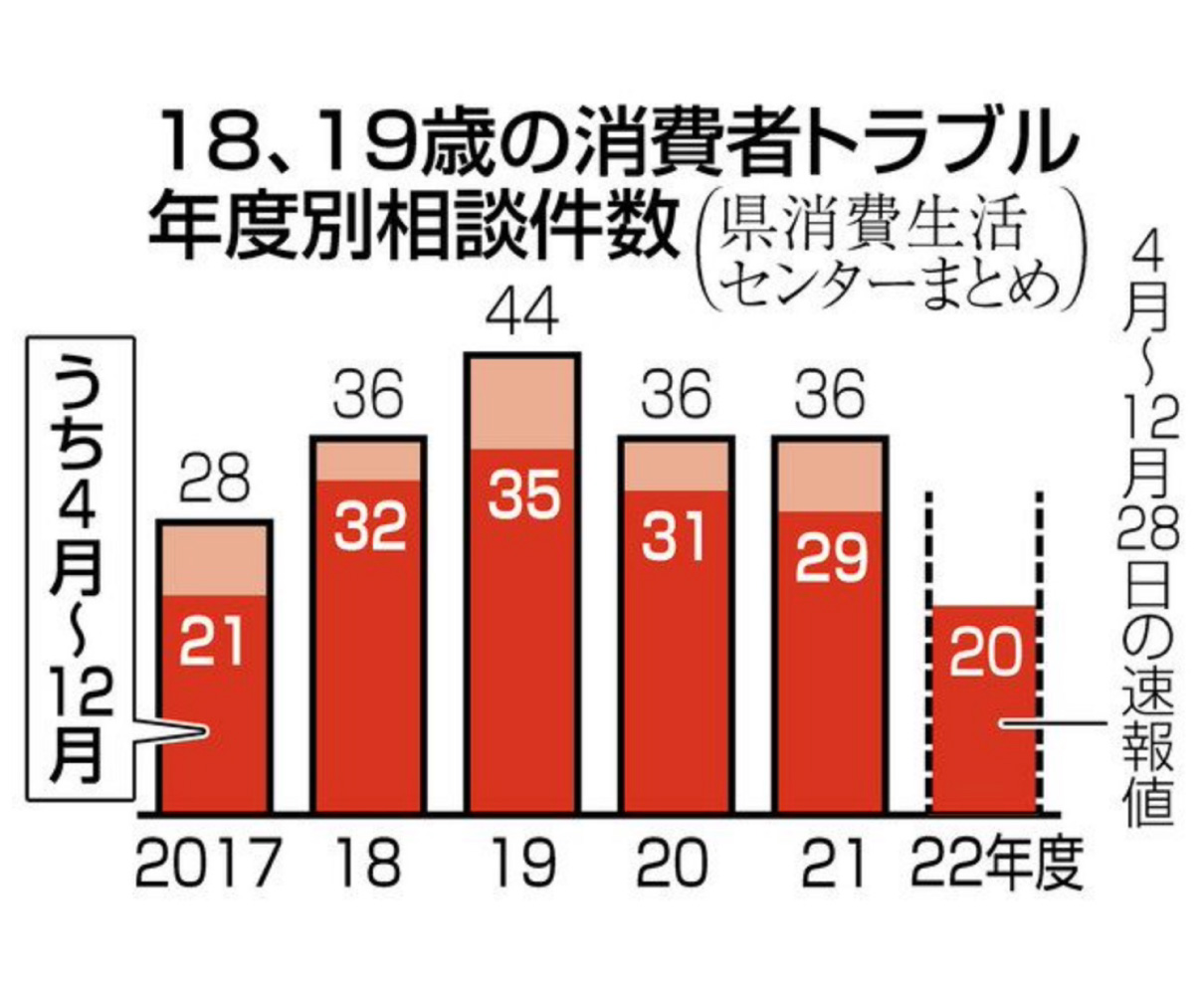 2022年4月に成人年齢が18歳に引き下げられたことに伴い増加が見込まれた県内の18、19歳の消費者トラブルについて、22年度の件数は12月28日時点で、前年度同期比9件減の20件(速報値)だったことが、県消費生活センターのまとめで分かった。