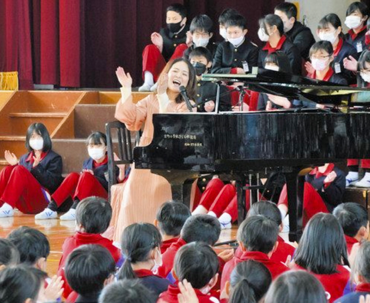 越前市吉野小学校の卒業式で卒業生が歌う「僕たちの景色〜吉野小を描いて〜」を作詞・作曲したシンガー・ソングライターのヒナタカコさん(坂井市在住)が9日、同校を訪れ、6年生72人に歌唱指導をした。ミニコンサートも開かれ、児童たちに音楽の楽しさを伝えた。(堂下佳鈴)