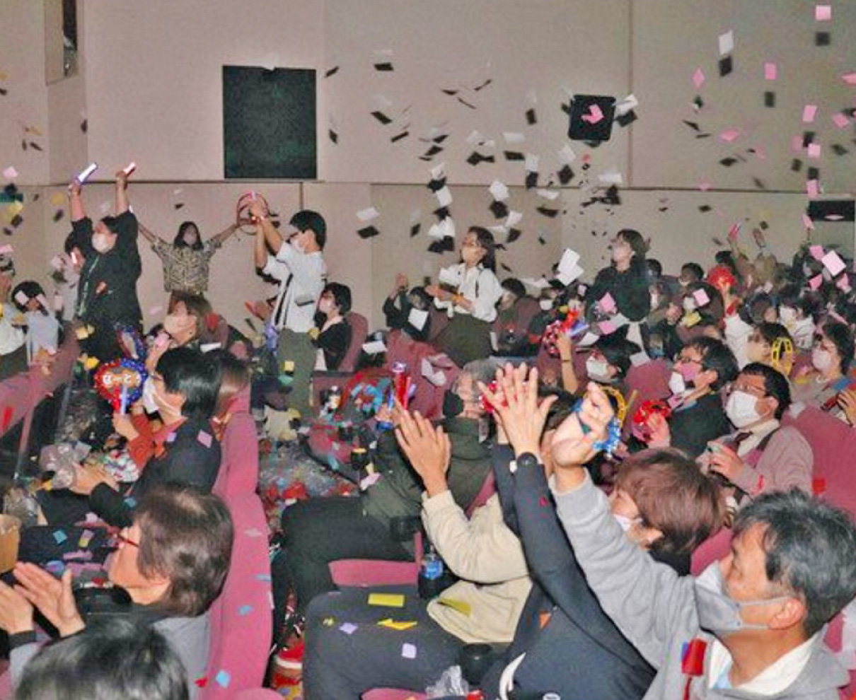 映画上映中に声を出したり踊ったり、鳴り物や紙吹雪を使ったりできる映画鑑賞会が1日、福井市順化1の映画館「メトロ劇場」で開かれ、アクションシーン満載のインド映画「RRR(アールアールアール)」に大歓声が上がった。