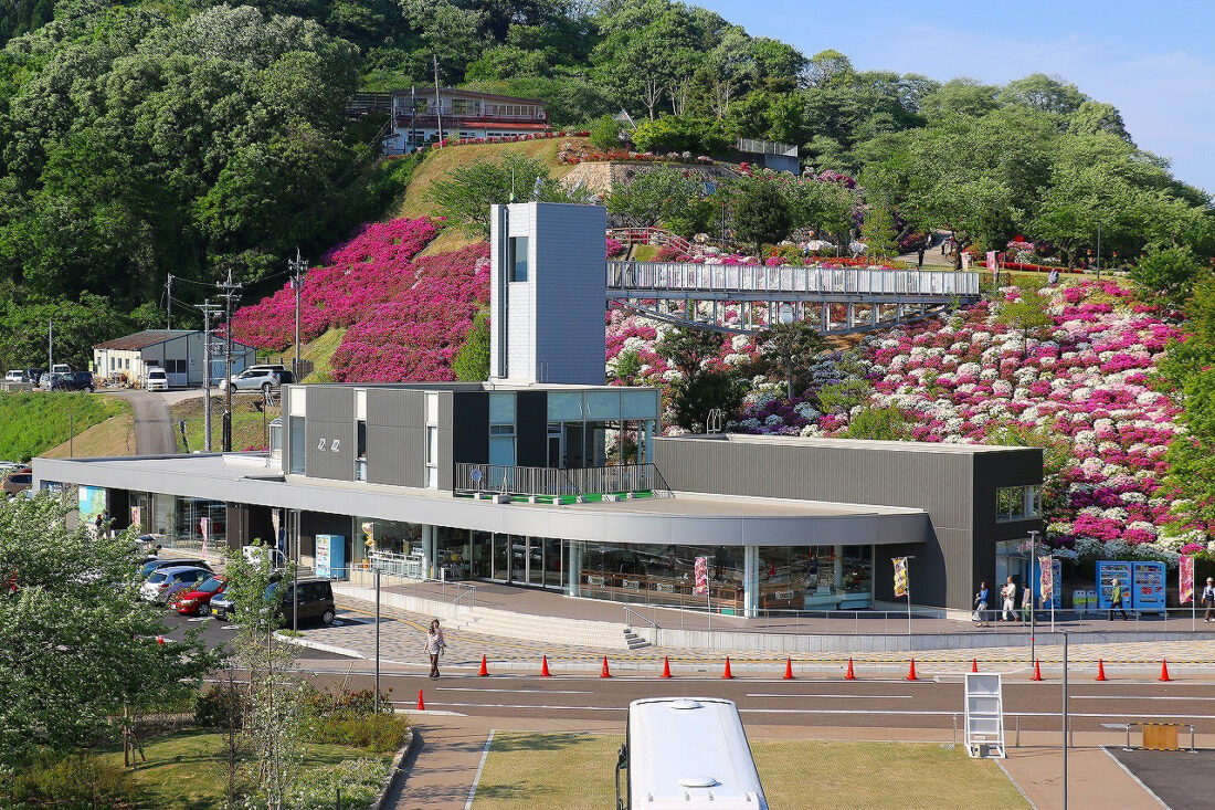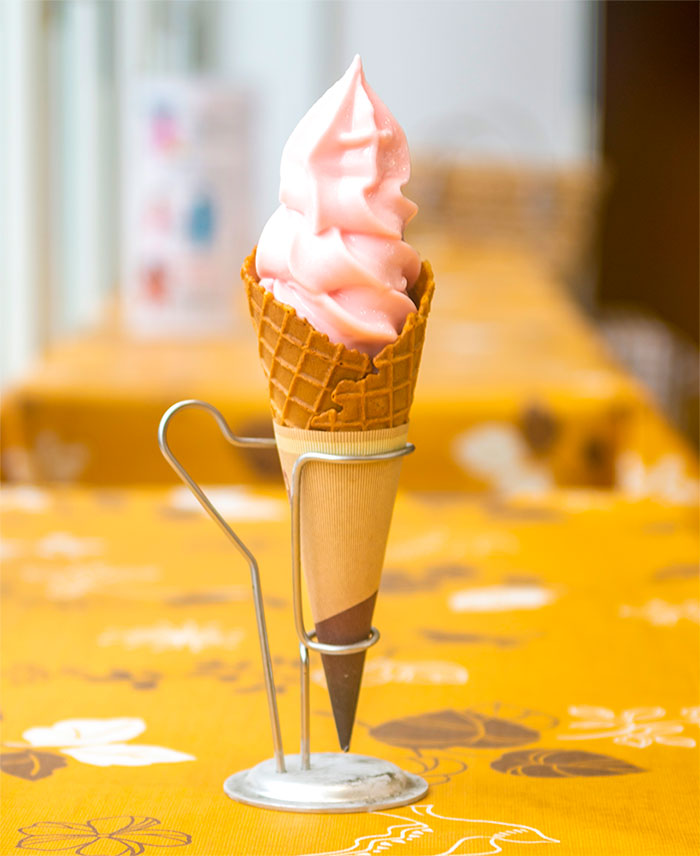 日本海側髄一のつつじの名所と知られる「西山公園」。この美しい花をイメージした道の駅限定のソフトクリームが「つつじソフト」380円。
