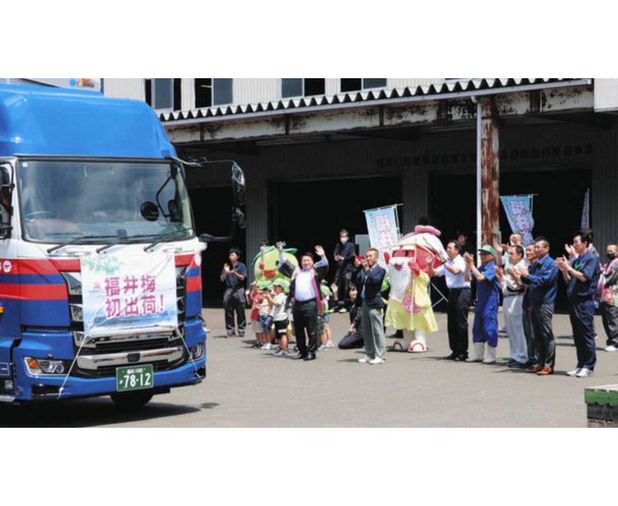 県特産の福井梅の出荷が一日から始まり、主要産地の若狭町ではウメ農家が朝から収穫作業に汗を流した。選果場では初出荷を祝う式典が開かれ、関係者がウメを満載したトラックの出発を見送った。