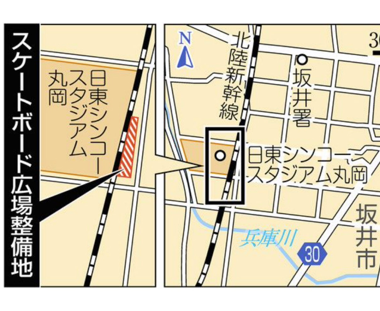 坂井市は日東シンコースタジアム丸岡(丸岡スポーツランド、丸岡町長崎)東側に、スケートボード広場を新設する。初心者中心の利用を想定し、県内の先行施設とは一線を画して全面を平たんなコンクリート敷とする。8月下旬に着工、12月の完成を目指し、可搬式のセクション(構造物)を置くことは可能としている。