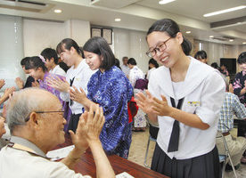 住民と交流笑顔の輪 進明、大東中生 合唱、お点前披露 前川智子 7年前 茶摘みの歌に合わせてお年寄りと笑顔で手遊びする生徒たち=福井市啓蒙公民館で 福井福井市の進明中学校茶華道部と美術部、大東中学校合唱部が二十四日、同市啓蒙公民館でお点前や歌声を披露したり住民の似顔絵を描いて、地域住民と交流した。 (日刊県民福井)続きはこちらから