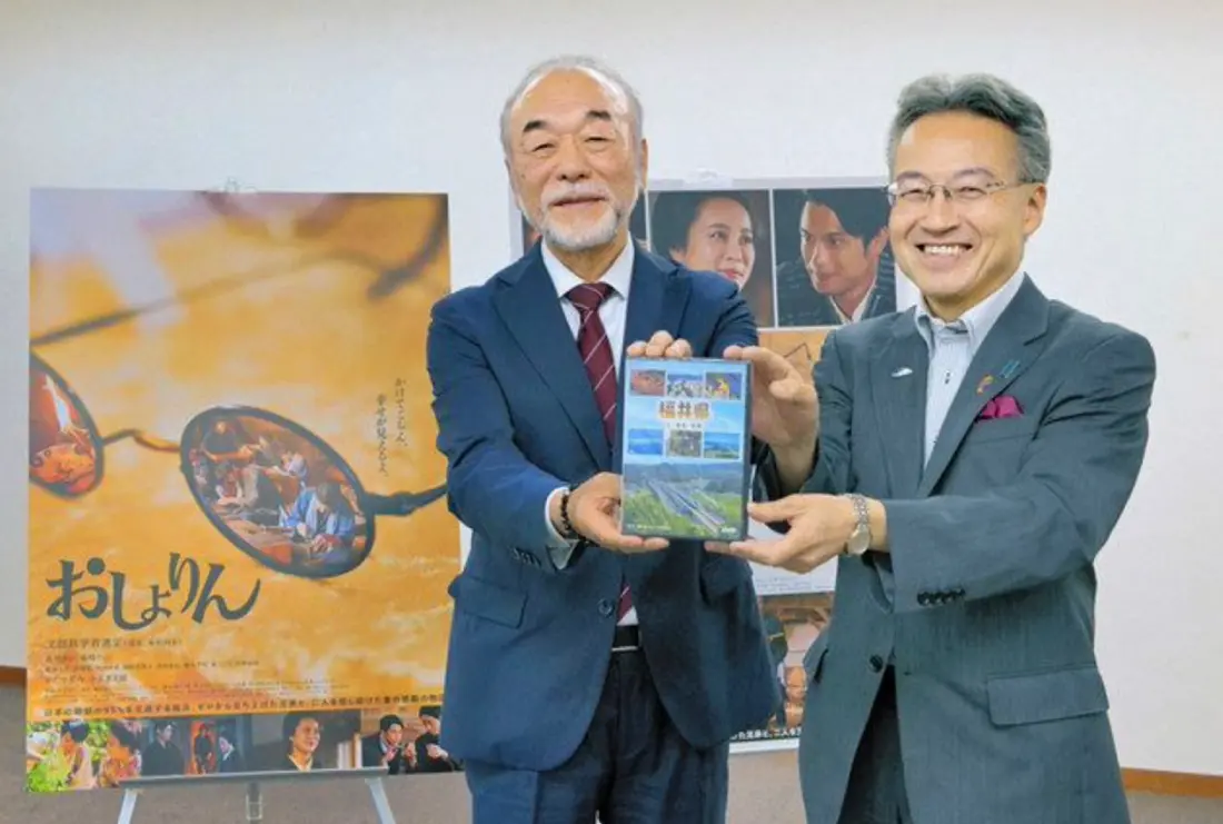 明治期の麻生津村(現福井市)で眼鏡産業の礎を築いた増永兄弟らの活躍を描いた秋公開の映画「おしょりん」について、制作委員会の新道忠志委員長が6日、杉本達治知事を県庁に訪ね、完成を報告した。本編と併せて準備してきた福井県PR動画も披露。杉本知事は、来年春の北陸新幹線県内開業に触れながら「見た皆が福井に行きたいと感じると思う」と期待した。(北原愛)