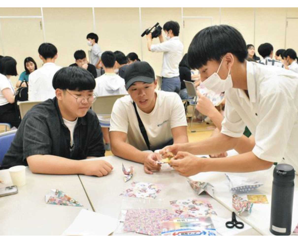 敦賀市の姉妹都市である韓国・東海(トンヘ)市の青少年使節団が二十七日、敦賀高校を訪れ、人文進学科二年生の二十一人と交流をした。折り紙や民謡踊り体験など日本の文化に触れて、親睦を深めた。