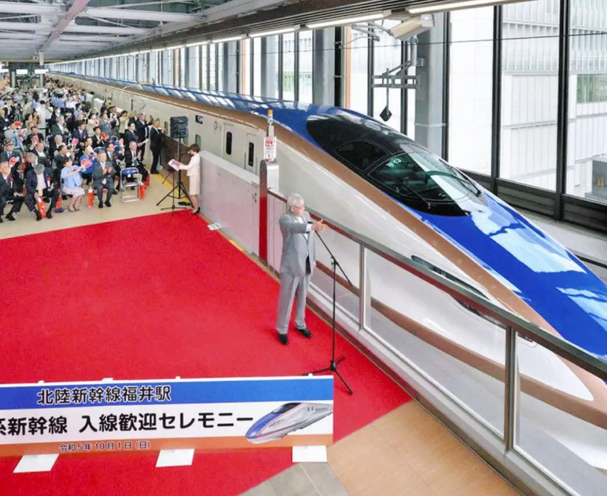 来年3月16日に迫る北陸新幹線金沢-敦賀間の開業に向け、営業用車両「W7系」の入線を祝うセレモニーが1日、県内四つの新幹線駅ホームであった。総勢2千人ほどの地元住民らが手を振ってブルーラインの車両を出迎え、開業への期待を一層膨らませた。歓迎式典は石川県内の延伸区間の停車駅となる小松、加賀温泉の2駅でも行われた。(玉田能成、林侑太郎)