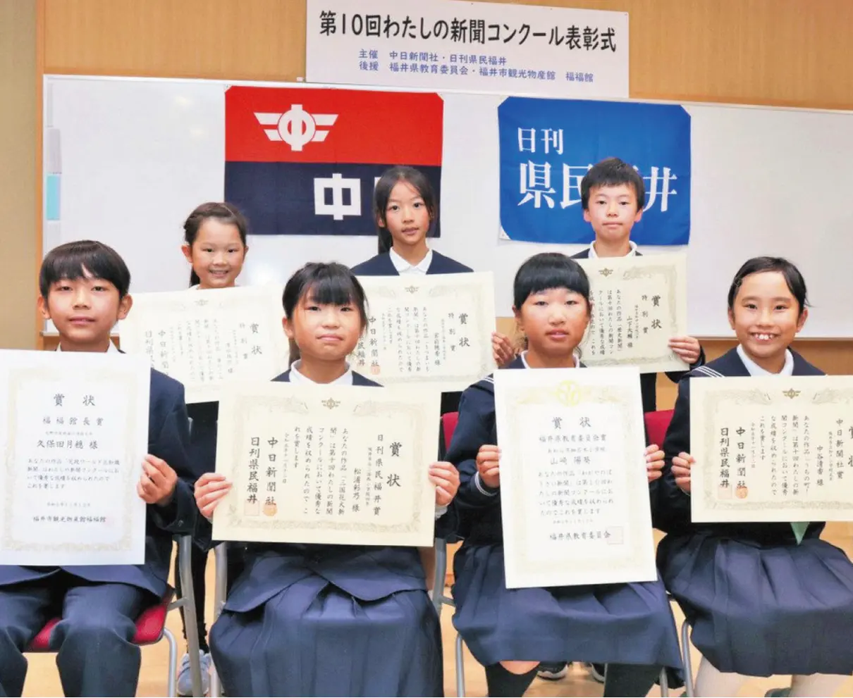 第10回「わたしの新聞」コンクール(日刊県民福井・中日新聞社主催、県教育委員会・福井市観光物産館福福館後援)の表彰式が12日、福井市のハピリン内にあるイベントホール「福福小屋」であった。(曽根智貴)