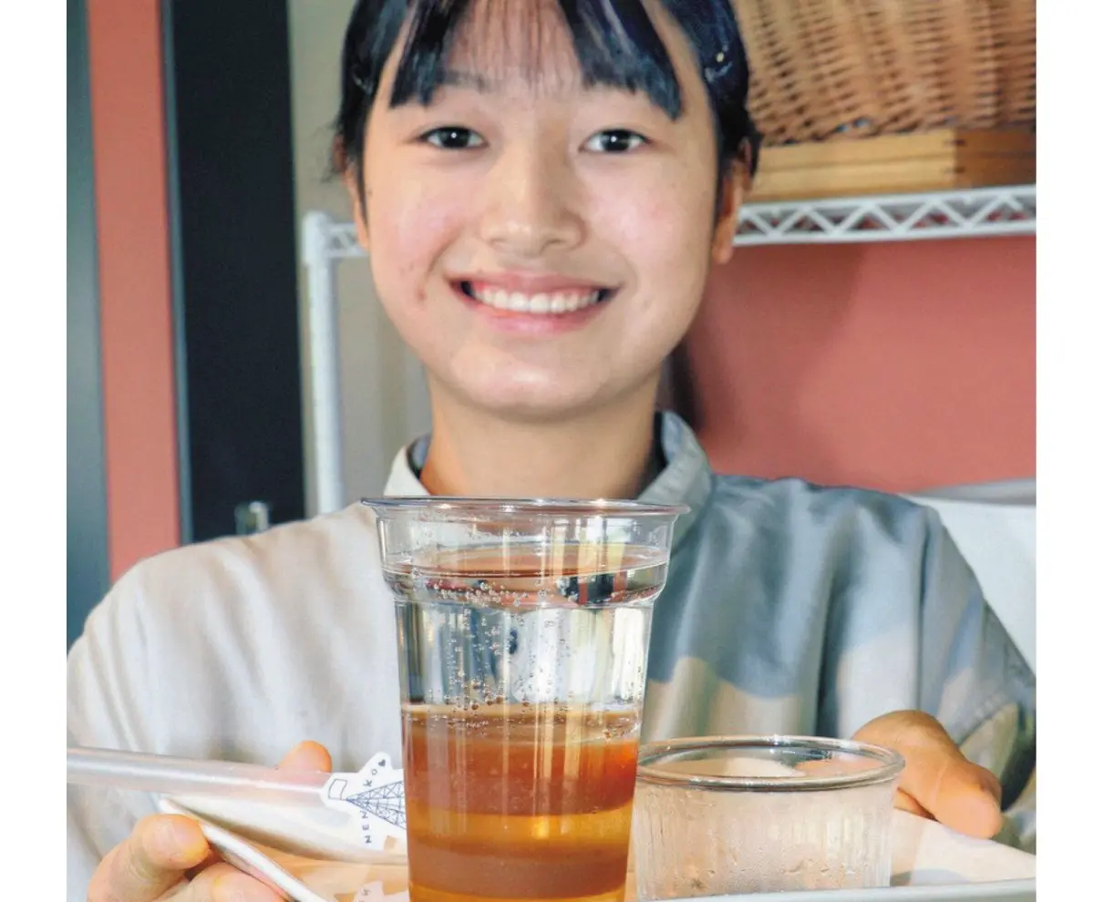 若狭町の水月湖で採取される年縞(ねんこう)をモチーフに、色の違うゼリーが何層にも重なるスイーツ「年縞ゼリーソーダ」を、同町上中中学校3年の宮田あいささんが開発した。底のゼリーにストローを刺して抜くと、年縞採取時のボーリング調査のように、しま模様を抜き取ることができる。24日の限定販売で約30個が完売し、宮田さんは「多くの人に年縞を身近に感じてもらいたかった」と笑顔を見せた。(林侑太郎)