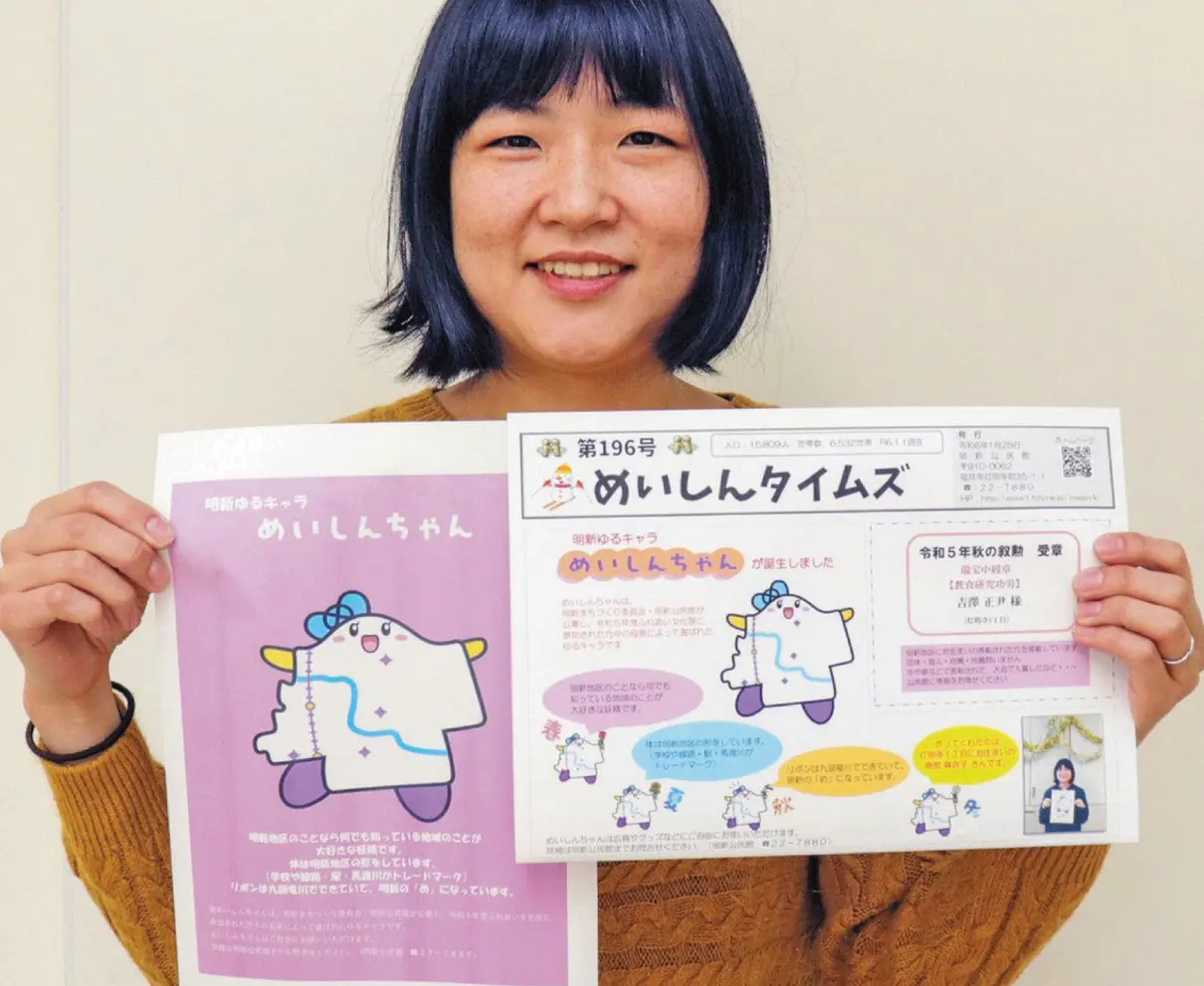 福井市明新地区のゆるキャラに、主婦の南部麻衣子さん(34)=灯明寺1=が考案した「めいしんちゃん」が選ばれ、1月発行の明新公民館だより「めいしんタイムズ」で初登場した。南部さんは2児の母で、「いろんなところに登場してくれると、子どもたちも喜ぶ」と頰を緩める。