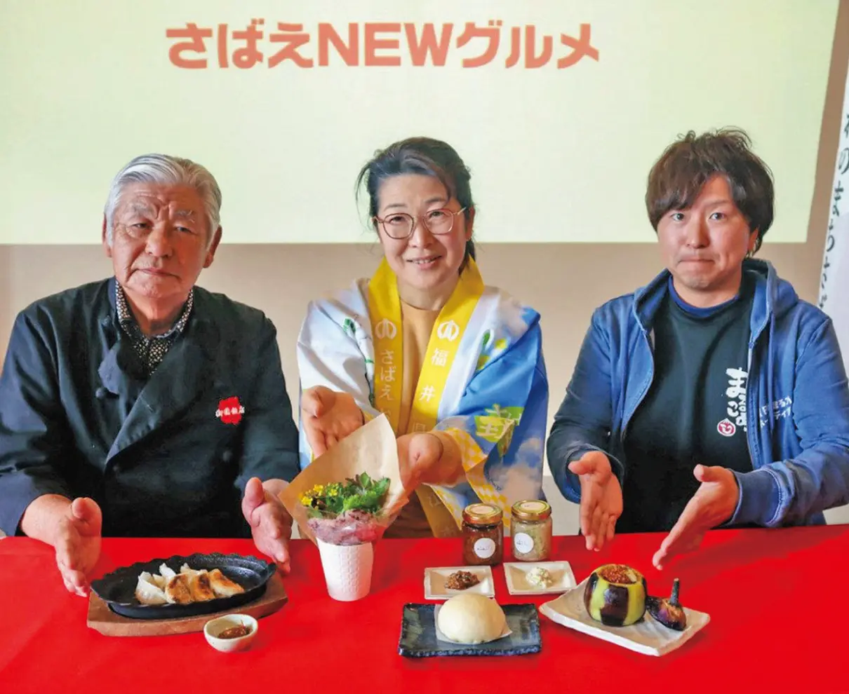鯖江市産の米「さばえ米」と市内事業者のアイデアを掛け合わせた新たなご当地グルメ4品が完成し18日、同市の鯖江商工会議所でお披露目された。ご当地グルメを発信し、間近に迫った北陸新幹線県内開業に向け、食による誘客や観光消費の拡大を図る。