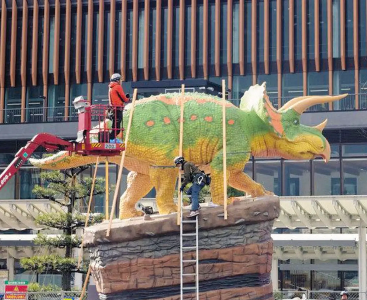 福井市は26日、JR福井駅東口広場で大型草食恐竜「トリケラトプス」の実物大ロボットの設置作業を実施した。隣接するえちぜん鉄道福井駅の駅舎壁面では、翼竜「プテラノドン」を実物大で描いた壁面絵画の設置作業も進めている。いずれも3月16日の北陸新幹線県内開業までに完成する予定で、「恐竜王国ふくい」のアピール強化に向けて着々と準備が進んでいる。