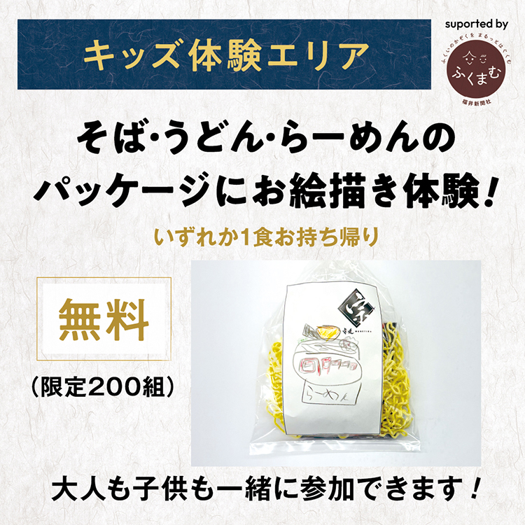 そば・うどん・ラーメンのパッケージに、好きな絵を描いてみよう。「これなら売れる?」「麺売り場で目立つ?」「プレゼントにするなら?」な~んて考えながら、世界に一つだけのオリジナルパッケージを作ってください。子供も大人も大歓迎!