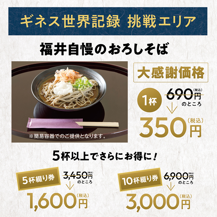 そうなんです! ですから価格も通常一杯690円のところ、350円の大感謝価格としました。それに、5枚綴りや10枚綴りもご用意していますので、お一人で何杯でもOK。朝から夕方までの開催なので、朝食・昼食・夕食として召し上がっていただくもよし、ご家族、ご友人、お仲間とご一緒に味わうもよし。とにかく多くの皆さんと一緒にギネス記録を樹立したいのです。そして、福井のそば文化に新しい1ページを刻みたいのです!