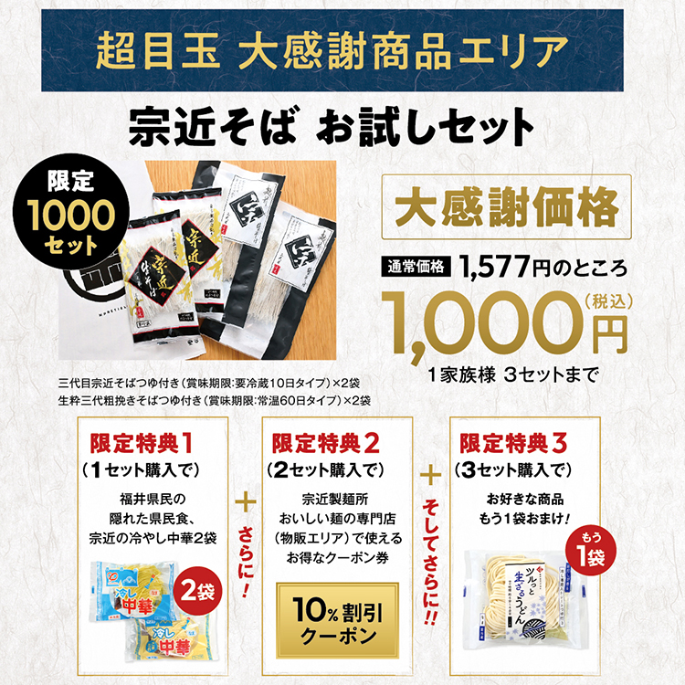 はい!! 弊社の商品を召し上がったことがない方や、当日、そばを食べて「もう一回、食べてみたい」と思われた方、もちろんいつもご購入していただいている皆様への感謝も込めて、超目玉セットをご用意しました。購入セット数によって、特典も増やしました。たくさん食べて、お得をゲットしてください。