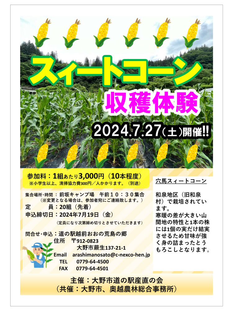 大野市和泉地区で栽培される「穴馬スィートコーン」の収穫体験が7/27(土)に実施されます。「穴馬スィートコーン」は、甘味がとても強く、実もぎっしりと詰まった一級品です。大自然の中で収穫、採れたての恵みを味わう醍醐味をぜひ体験しましょう!