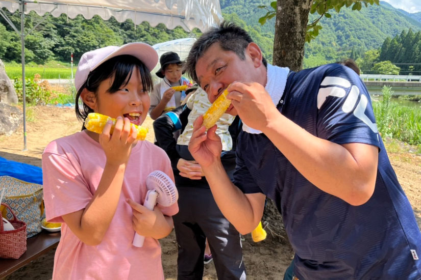 収穫体験が行われる和泉地区(旧和泉村)は、大野市の東部に位置し、東は岐阜県に隣接する場所。九頭竜川の源流地域であり、福井県と岐阜県を繋ぐ自然豊かなエリアです。そんな大自然に囲まれた圃場は昼夜の寒暖差が大きく、暑い日中と涼しい朝晩の気温差があるおかげで、糖分をたっぷりと蓄えた、甘味の強いトウモロコシを作り出します。この機会にぜひ、味わってみてください!