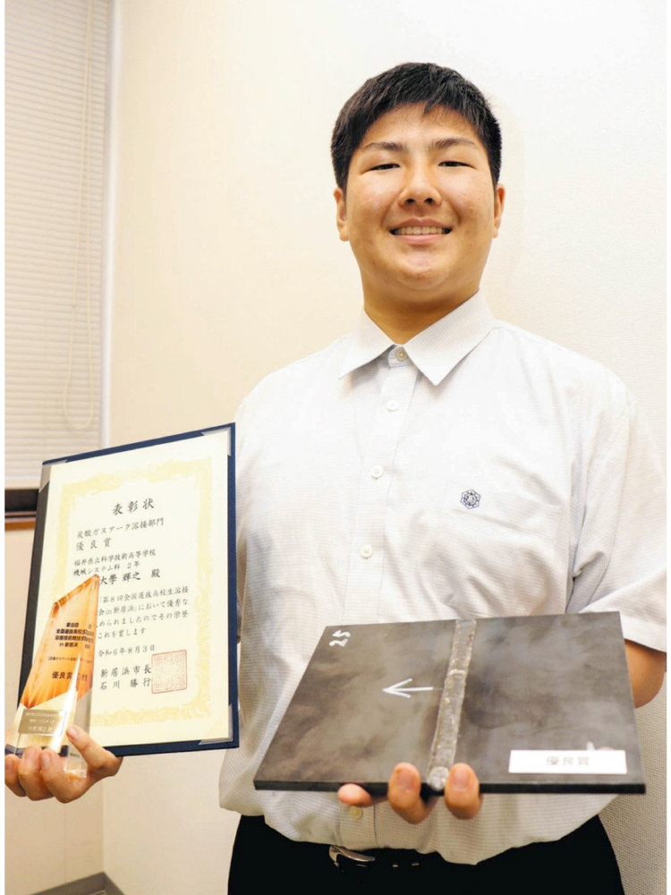 全国の高校生が溶接技術を競う「第8回全国選抜高校生溶接競技会」の炭酸ガスアーク溶接部門で、科学技術高校機械システム科2年の大学輝之さん(17)が優良賞(3位)に輝いた。同部門の技術は授業では取り扱わないため、大学さんは福井鉄工(福井市若栄町)の3日間のインターンシップ(就業体験)で特訓した。同社で2日、報告会があり、大学さんは「社員の助言のおかげもあり、練習の成果を発揮できた」と喜んだ。