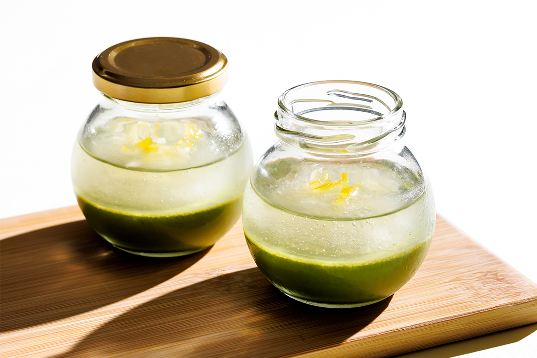 抹茶レアチーズの上にレモン果肉ゼリー、はちみつレモンソースと3層仕立ての夏季限定スイーツは涼を感じる一品