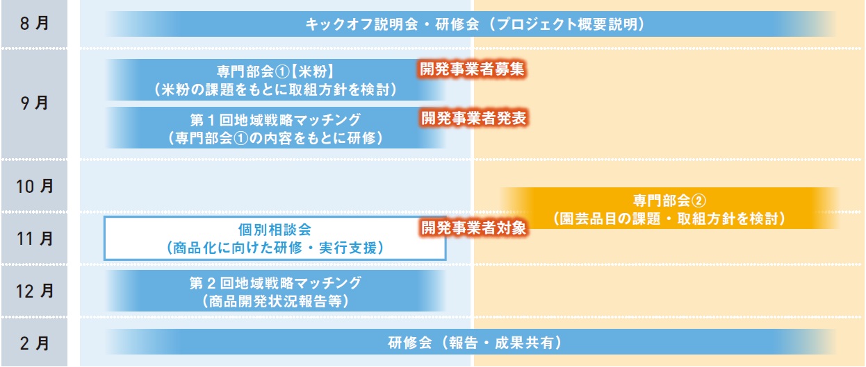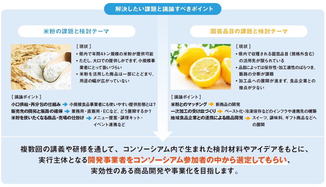 米粉・園芸品目を活用したビジネス(新商品開発等)に取り組む事業者などが該当し、「どのように売るか」「どう仕組み化するか」を具体的に設計・実行します。