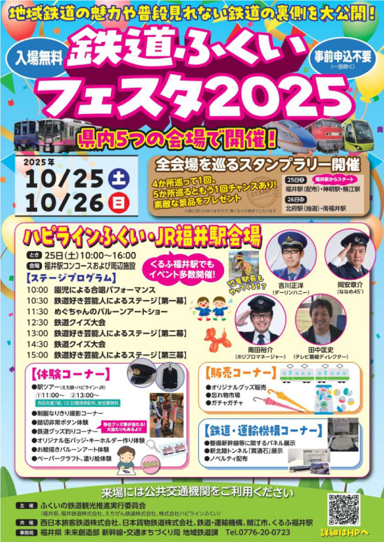 では、会場ごとに実施するイベントを紹介していきます。まず、メイン会場となる【ハピラインふくい・JR福井駅会場】では、10/25(土)に鉄道好き芸能人によるステージを開催。お笑いコンビ「ダーリンハニー」の吉川正洋さん、お笑いトリオ「ななめ45°」の岡安章介さん、ホリプロマネージャーの南田裕介さんら「鉄道BIG4」のメンバーと、鉄道好きディレクターの田中匡史さんが登場します。鉄道に関する豊富な知識を盛り込んだトークショーや鉄道に関するゲームなど、子どもから大人まで楽しめるステージとなっています。ほかにもめぐちゃんのバルーンアートショーや鉄道クイズ大会などで盛り上がります。