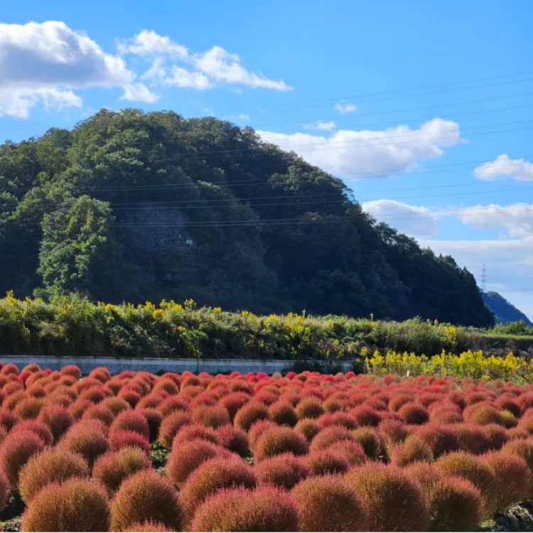 「道の駅 恐竜渓谷かつやま」の近くにあるかつやま恐竜橋下流右岸圃場では、耕作放棄地解消モデル事業としてコキアの植栽が行われています。コキアの生育がよければ例年は『コキア紅葉まつり&収穫祭』として開催されます。モフモフとしたまんまるのかわいいコキアが並ぶ景観も同時に楽しんでくださいね!