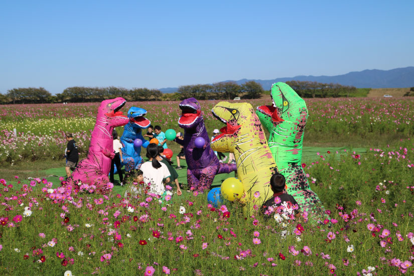 「コスモスまつり」のオープニングイベントでは、「琉球國祭り太鼓」(10:15~の予定) 、「オカリナ演奏会」(11:00~の予定)で祭りの雰囲気が盛り上がります。風船恐竜が神出鬼没に登場し、恐竜から風船がプレゼントされるといったサプライズもありますよ。